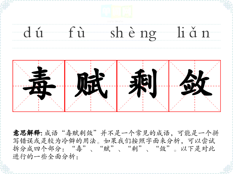 成语“毒赋剩敛”并不是一个常见的成语,可能是一个拼写错误或是较为冷僻的用法。如果我们按照字面来分析,可以尝试拆分成四个部分:“毒”、“赋”、“剩”、“敛”。以下是对此进行的一些全面分析: