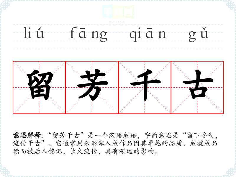 “留芳千古”是一个汉语成语,字面意思是“留下香气,流传千古”。它通常用来形容人或作品因其卓越的品质、成就或品德而被后人铭记,长久流传,具有深远的影响。
