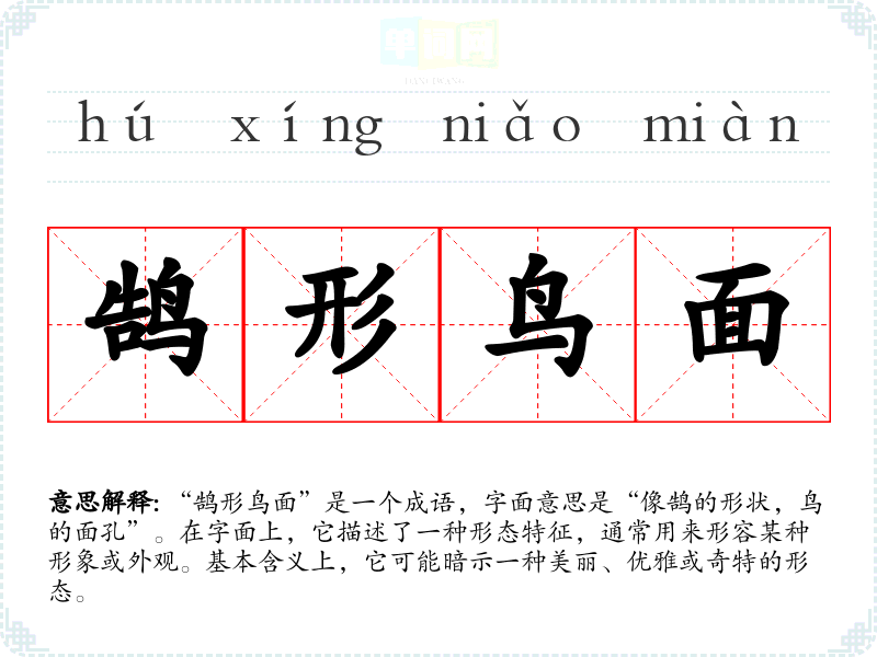 “鹄形鸟面”并不是一个广泛流传的成语,因此其具体的历史背景和典故较为稀缺。然而,鹄(即白鹤)在**文化中常被视为高洁和优雅的象征,且鸟类的形象在许多文学作品中用于表达自由与灵动。因此,可以推测该成语可能源自于对自然界中鸟类形态的观察与赞美。