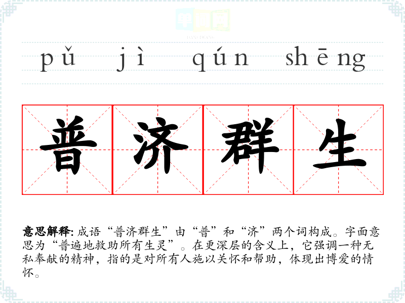 成语“普济群生”由“普”和“济”两个词构成。字面意思为“普遍地救助所有生灵”。在更深层的含义上,它强调一种无私奉献的精神,指的是对所有人施以关怀和帮助,体现出博爱的情怀。
