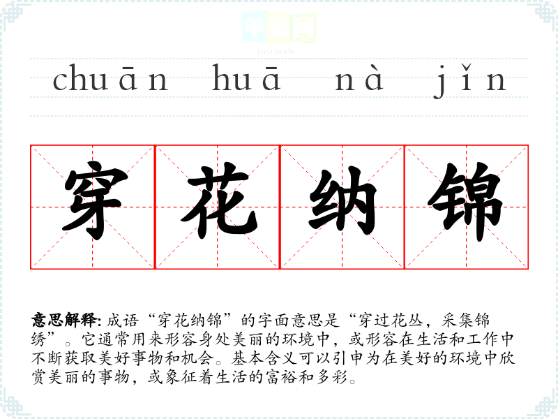 成语“穿花纳锦”的字面意思是“穿过花丛,采集锦绣”。它通常用来形容身处美丽的环境中,或形容在生活和工作中不断获取美好事物和机会。基本含义可以引申为在美好的环境中欣赏美丽的事物,或象征着生活的富裕和多彩。