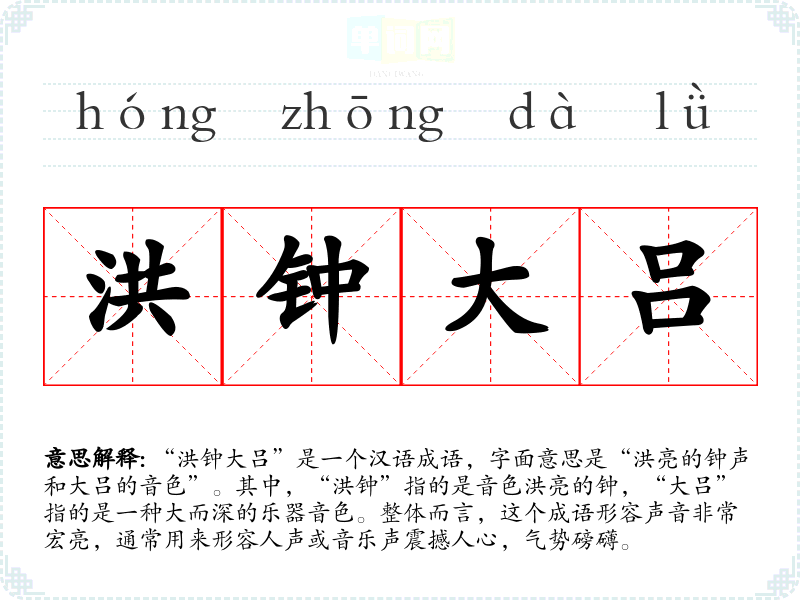 “洪钟大吕”是一个汉语成语,字面意思是“洪亮的钟声和大吕的音色”。其中,“洪钟”指的是音色洪亮的钟,“大吕”指的是一种大而深的乐器音色。整体而言,这个成语形容声音非常宏亮,通常用来形容人声或音乐声震撼人心,气势磅礴。