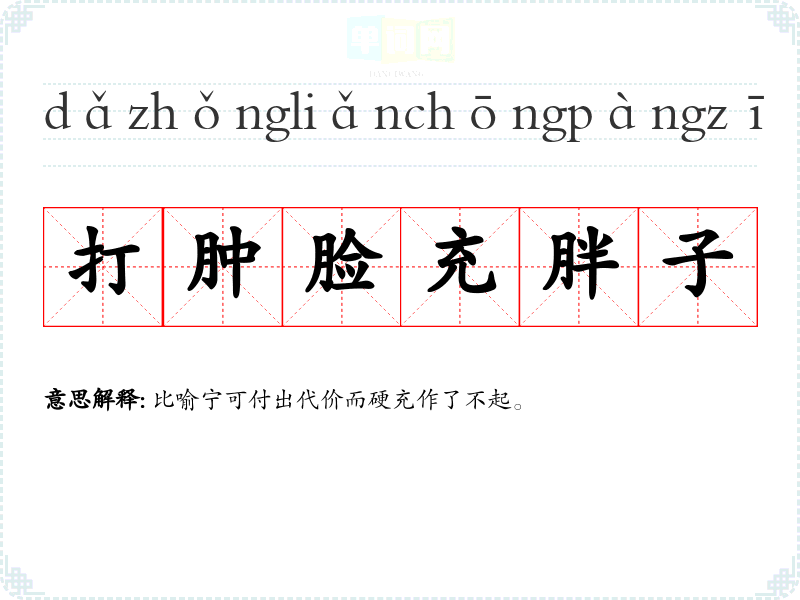 | 打肿脸充胖子 | 比喻宁可付出代价而硬充作了不起。 |