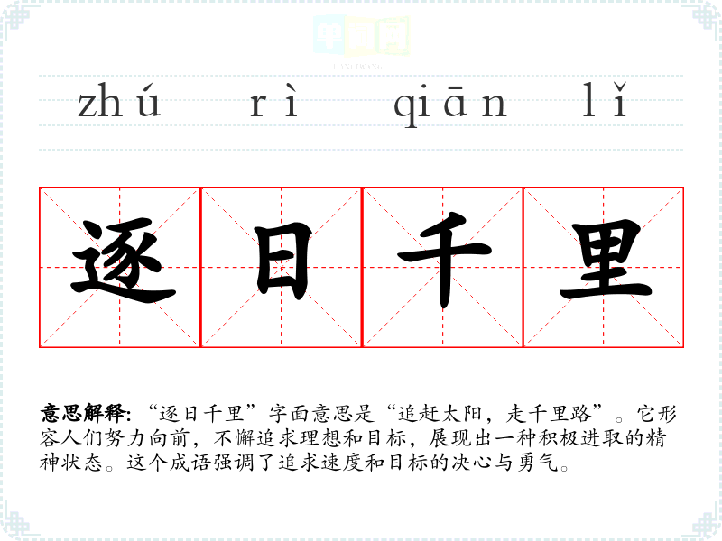- 演讲:在励志演讲中,可以用“逐日千里”来激励听众,强调追求梦想的重要性。