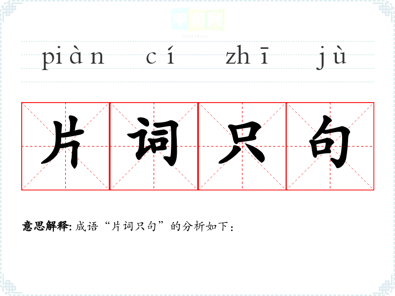 成语“片词只句”的具体来源不详,看似并没有明确的历史典故,但可以理解为对语言表达的概括,反映了文学和口头表达中的一种常见现象。在古代文人通常追求辞藻的华丽和句子的结构完整,这种成语则隐含了对这种追求的反思。