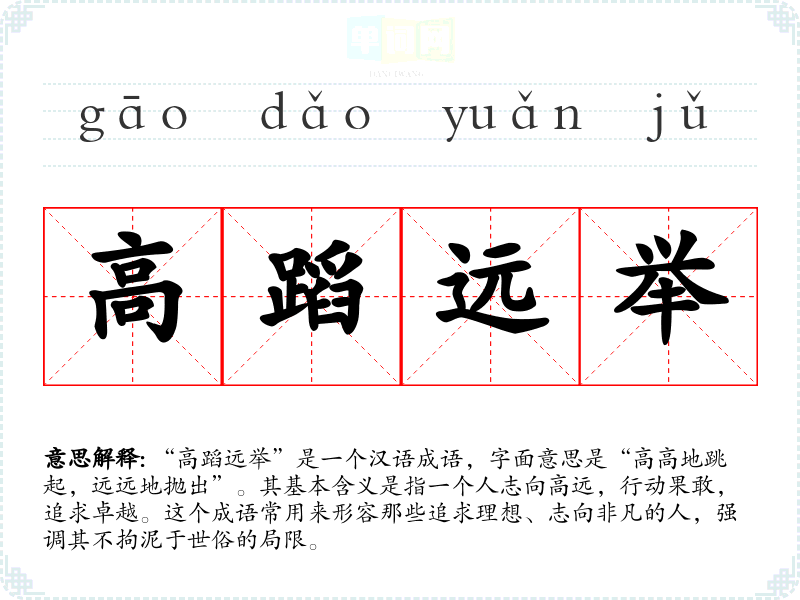 “高蹈远举”给我一种激励和向上的感觉。它提醒我在生活中要有追求,不应满足于现状。同时,这也让我联想到那些在逆境中不屈不挠、勇往直前的人物形象。