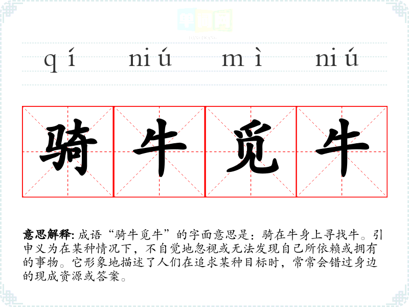 成语“骑牛觅牛”的字面意思是:骑在牛身上寻找牛。引申义为在某种情况下,不自觉地忽视或无法发现自己所依赖或拥有的事物。它形象地描述了人们在追求某种目标时,常常会错过身边的现成资源或答案。