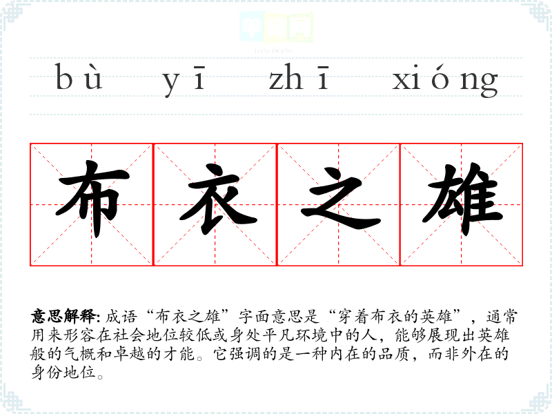 成语“布衣之雄”字面意思是“穿着布衣的英雄”,通常用来形容在社会地位较低或身处平凡环境中的人,能够展现出英雄般的气概和卓越的才能。它强调的是一种内在的品质,而非外在的身份地位。