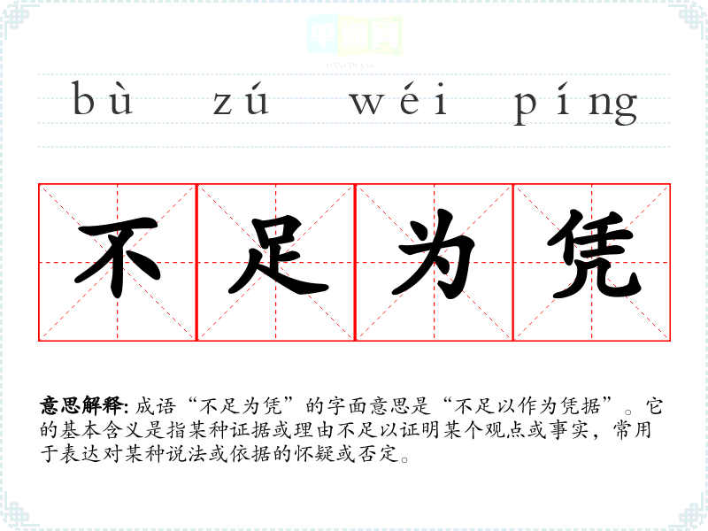 成语“不足为凭”的字面意思是“不足以作为凭据”。它的基本含义是指某种证据或理由不足以证明某个观点或事实,常用于表达对某种说法或依据的怀疑或否定。