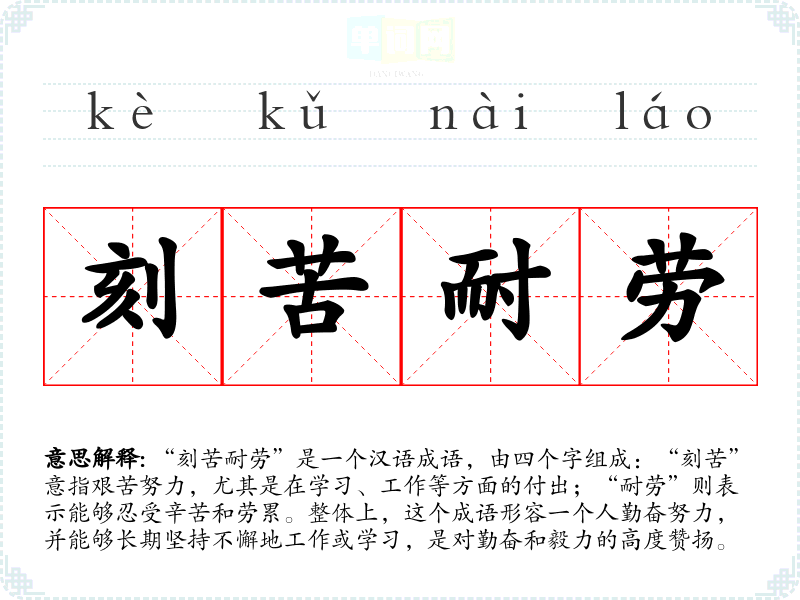 “刻苦耐劳”是一个汉语成语,由四个字组成:“刻苦”意指艰苦努力,尤其是在学、工作等方面的付出;“耐劳”则表示能够忍受辛苦和劳累。整体上,这个成语形容一个人勤奋努力,并能够长期坚持不懈地工作或学,是对勤奋和毅力的高度赞扬。