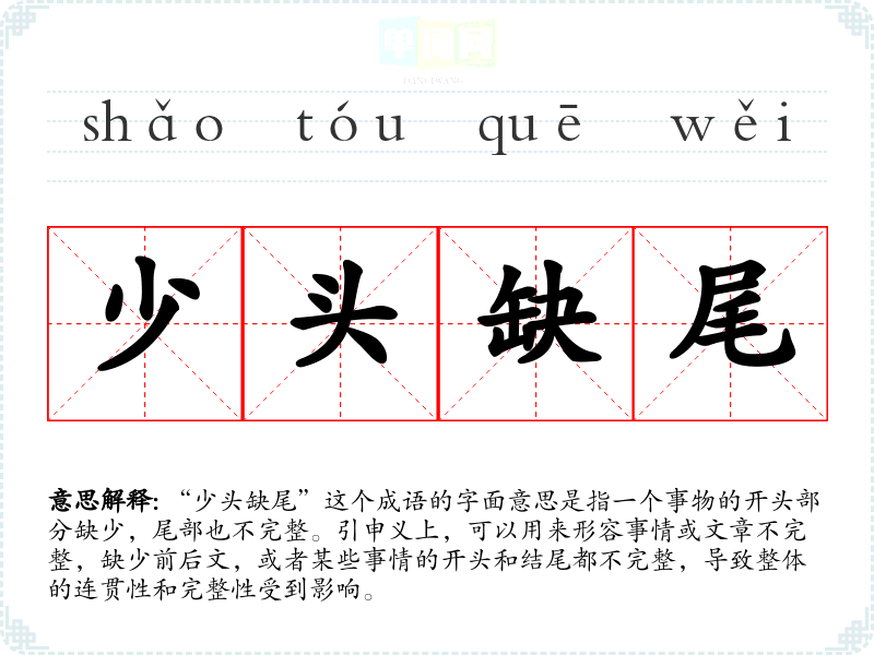 “少头缺尾”这个成语的字面意思是指一个事物的开头部分缺少,尾部也不完整。引申义上,可以用来形容事情或文章不完整,缺少前后文,或者某些事情的开头和结尾都不完整,导致整体的连贯性和完整性受到影响。