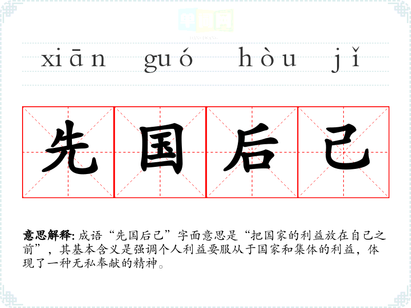 成语“先国后己”字面意思是“把国家的利益放在自己之前”,其基本含义是强调个人利益要服从于国家和集体的利益,体现了一种无私奉献的精神。