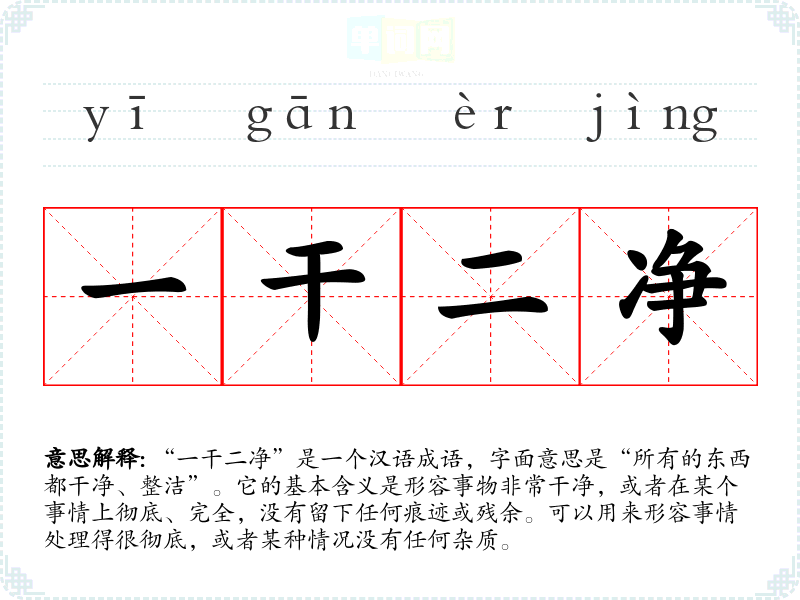 “一干二净”是一个汉语成语,字面意思是“所有的东西都干净、整洁”。它的基本含义是形容事物非常干净,或者在某个事情上彻底、完全,没有留下任何痕迹或残余。可以用来形容事情处理得很彻底,或者某种情况没有任何杂质。