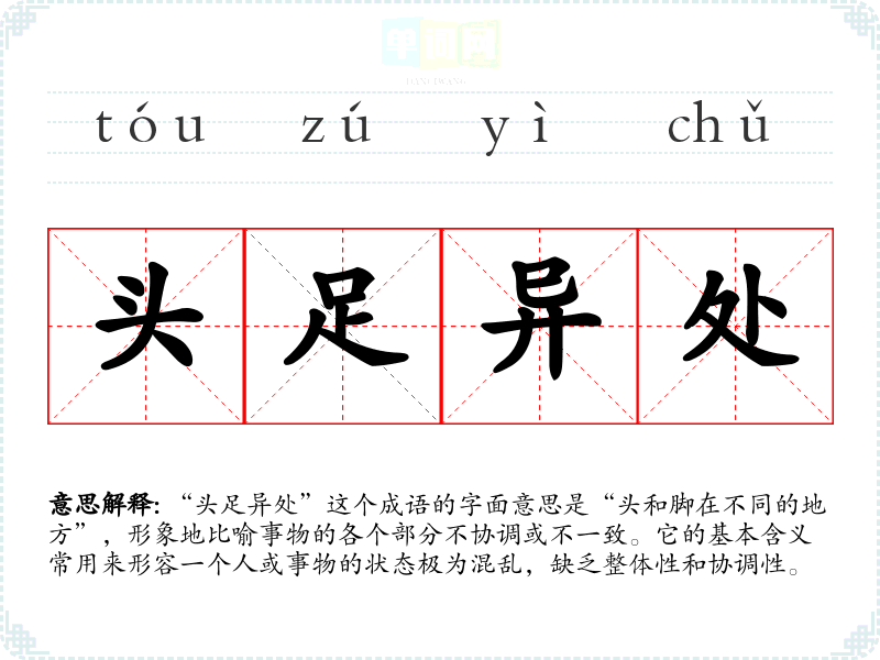 “头足异处”这个成语的字面意思是“头和脚在不同的地方”,形象地比喻事物的各个部分不协调或不一致。它的基本含义常用来形容一个人或事物的状态极为混乱,缺乏整体性和协调性。