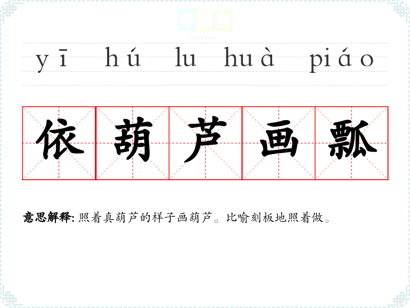 | 依葫芦画瓢 | 照着真葫芦的样子画葫芦。比喻刻板地照着做。 |