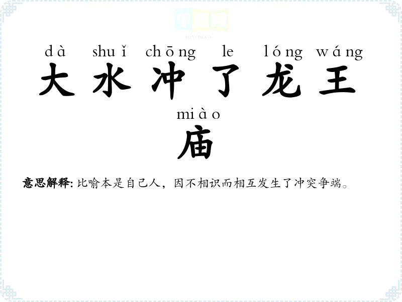 | 大水淹了龙王庙 | 龙王庙:管水之神的庙宇。比喻本是自己人,因不相识而互相之间发生了争端。 |