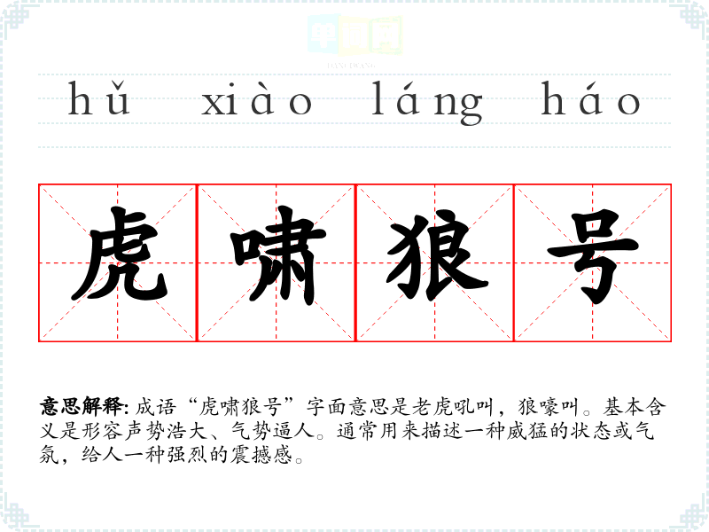 成语“虎啸狼号”字面意思是**吼叫,狼嚎叫。基本含义是形容声势浩大、气势逼人。通常用来描述一种威猛的状态或气氛,给人一种强烈的震撼感。