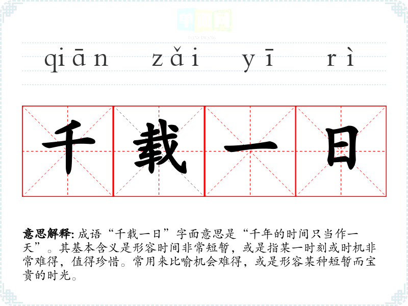 “千载一日”这一成语源自古代文人对时间的思考和感悟,虽然具体的历史出处并不明确,但它反映了古人对岁月流逝的无奈与珍惜。类似的表达在古代诗文中常有出现,强调时间的宝贵和瞬息万变。