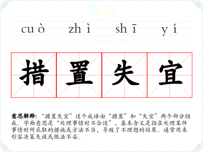 “措置失宜”这个成语由“措置”和“失宜”两个部分组成。字面意思是“处理事情时不合适”,基本含义是指在处理某件事情时所采取的措施或方法不当,导致了不理想的结果。通常用来形容决策失误或做法不妥。