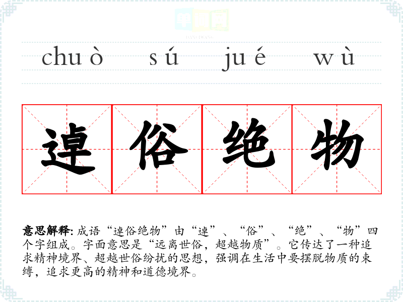 成语“逴俗绝物”由“逴”、“俗”、“绝”、“物”四个字组成。字面意思是“远离世俗,超越物质”。它传达了一种追求精神境界、超越世俗纷扰的思想,强调在生活中要摆脱物质的束缚,追求更高的精神和道德境界。