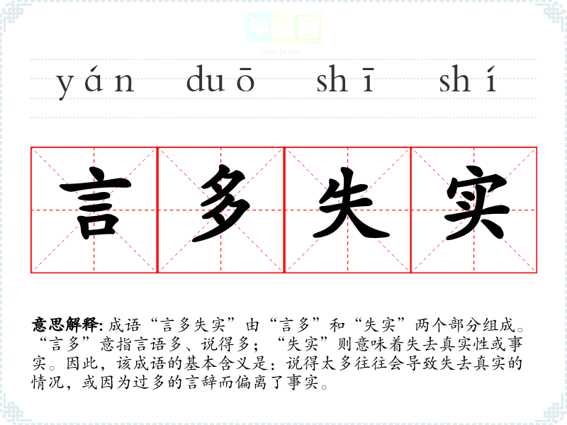 成语“言多失实”由“言多”和“失实”两个部分组成。“言多”意指言语多、说得多;“失实”则意味着失去真实性或事实。因此,该成语的基本含义是:说得太多往往会导致失去真实的情况,或因为过多的言辞而偏离了事实。