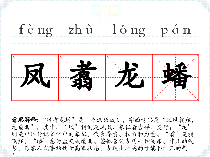 “凤翥龙蟠”是一个汉语成语,字面意思是“凤凰翱翔,龙蜷曲”。其中,“凤”指的是凤凰,象征着吉祥、美好;“龙”则是**传统文化中的象征,代表尊贵、权力和力量。“翥”是指飞翔,“蟠”意为盘旋或蜷曲。整体含义表明一种高昂、非凡的气势,形容人或事物处于高峰状态,表现出卓越的才能和非凡的气质。