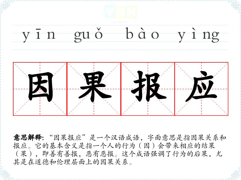 “因果报应”是一个汉语成语,字面意思是指因果关系和报应。它的基本含义是指一个人的行为(因)会带来相应的结果(果),即善有善报,恶有恶报。这个成语强调了行为的后果,尤其是在道德和伦理层面上的因果关系。