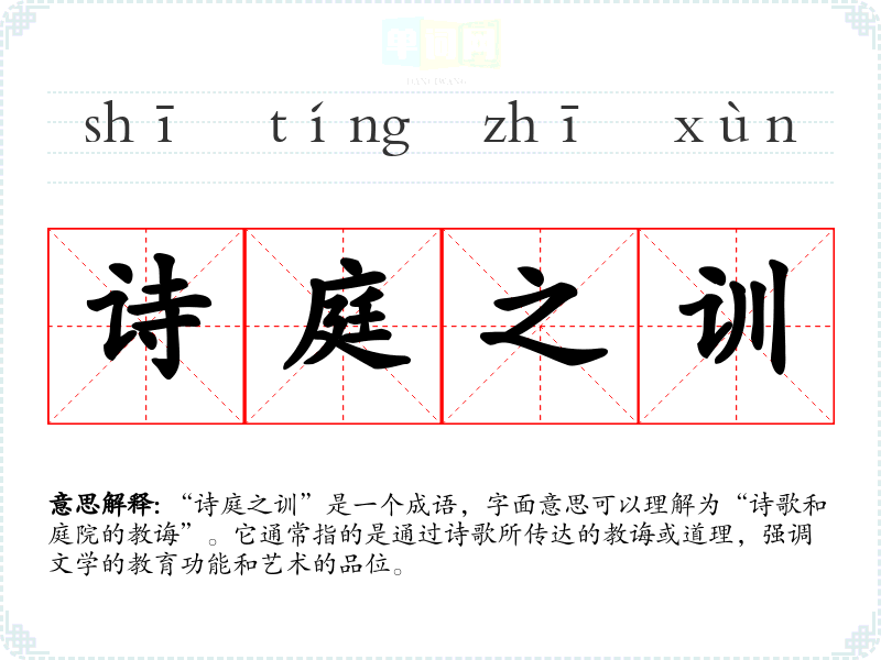 “诗庭之训”是一个成语,字面意思可以理解为“诗歌和庭院的教诲”。它通常指的是通过诗歌所传达的教诲或道理,强调文学的教育功能和艺术的品位。