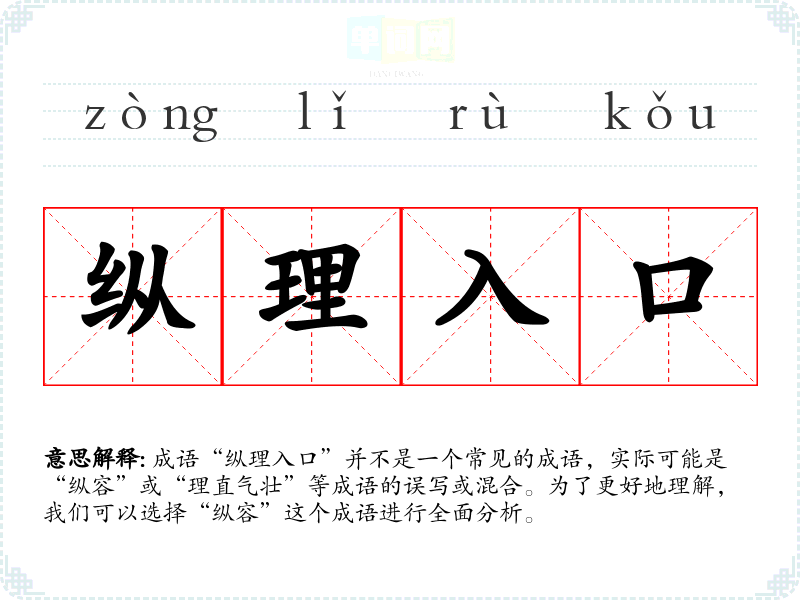 成语“纵理入口”并不是一个常见的成语,实际可能是“纵容”或“理直气壮”等成语的误写或混合。为了更好地理解,我们可以选择“纵容”这个成语进行全面分析。