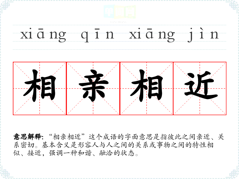 “相亲相近”这个成语的字面意思是指彼此之间亲近、关系密切。基本含义是形容人与人之间的关系或事物之间的特性相似、接近,强调一种和谐、融洽的状态。