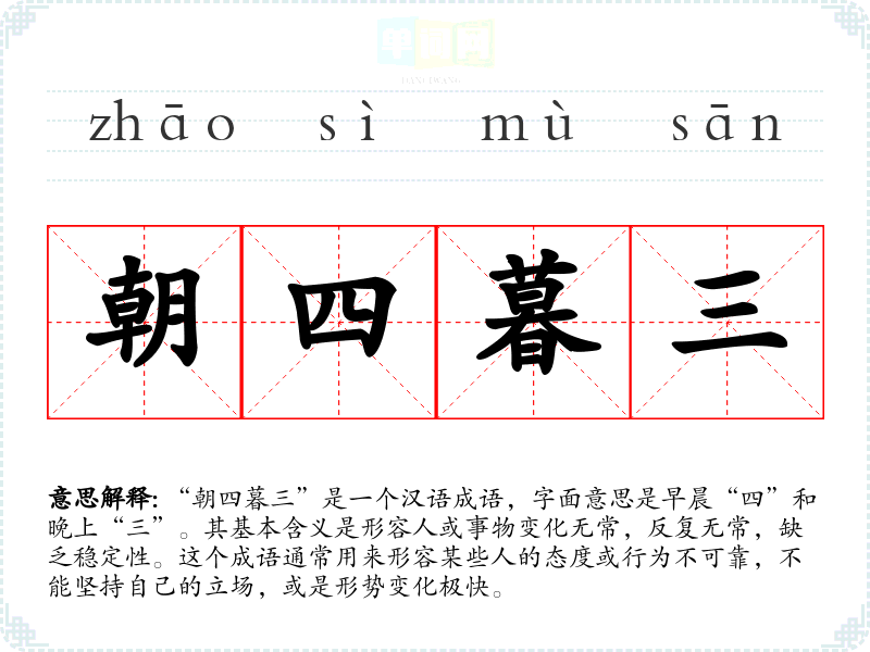 “朝四暮三”是一个汉语成语,字面意思是早晨“四”和晚上“三”。其基本含义是形容人或事物变化无常,反复无常,缺乏稳定性。这个成语通常用来形容某些人的态度或行为不可靠,不能坚持自己的立场,或是形势变化极快。