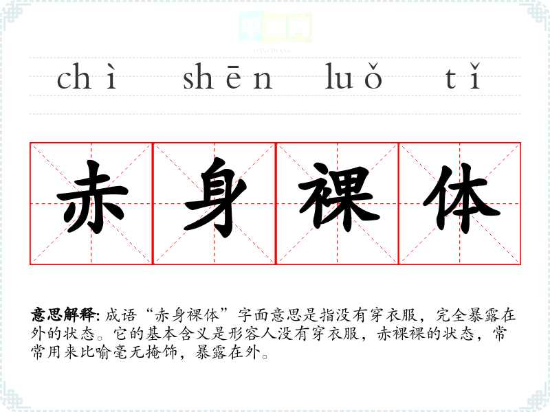 | 赤身裸体 | 赤:光着。大部分身体或全身裸露。 |