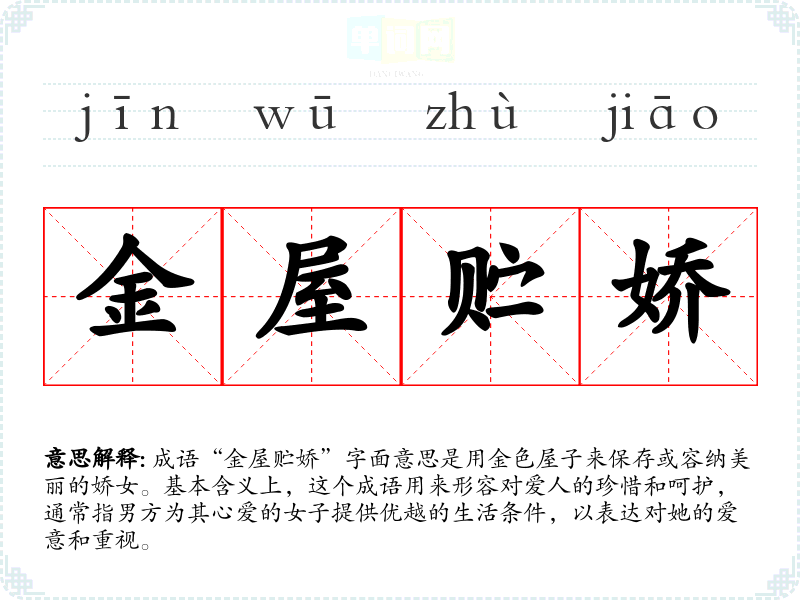成语“金屋贮娇”字面意思是用金色屋子来保存或容纳美丽的娇女。基本含义上,这个成语用来形容对爱人的珍惜和呵护,通常指男方为其心爱的女子提供优越的生活条件,以表达对她的爱意和重视。