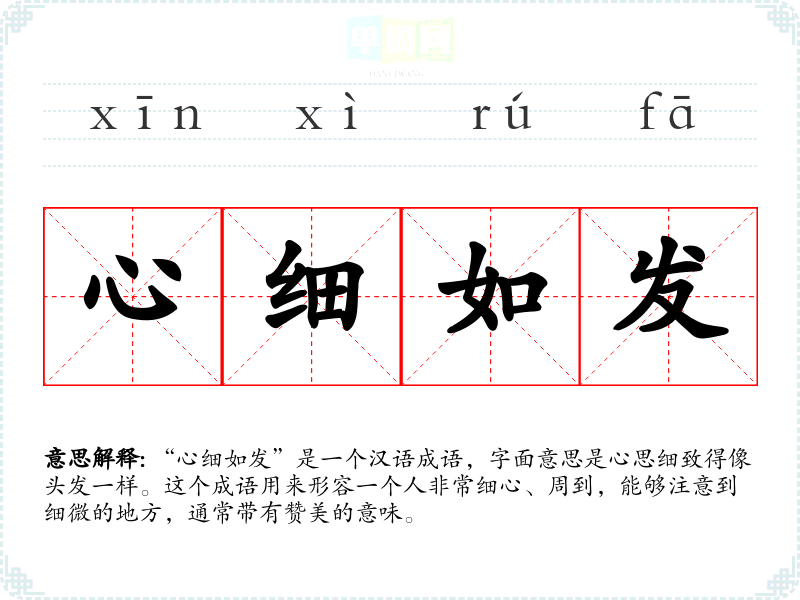 “心细如发”是一个汉语成语,字面意思是心思细致得像头发一样。这个成语用来形容一个人非常细心、周到,能够注意到细微的地方,通常带有赞美的意味。