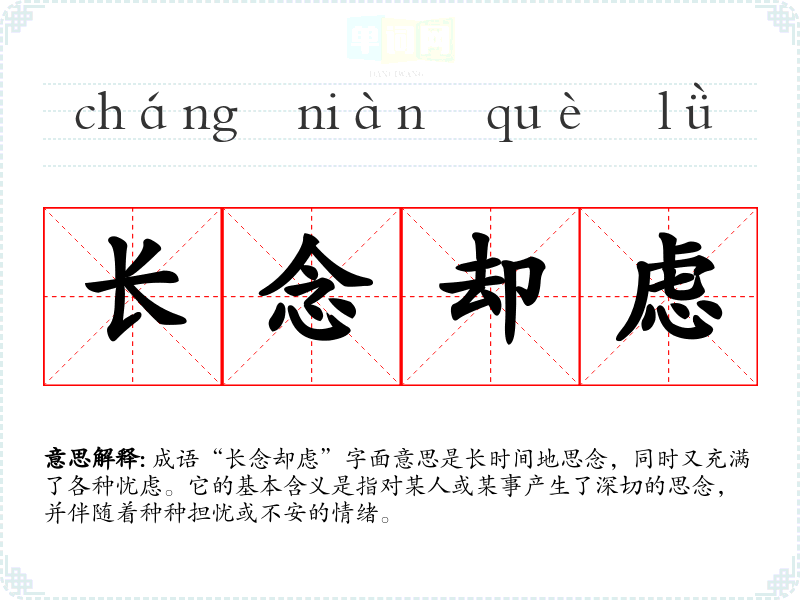 成语“长念却虑”字面意思是长时间地思念,同时又充满了各种忧虑。它的基本含义是指对某人或某事产生了深切的思念,并伴随着种种担忧或不安的情绪。