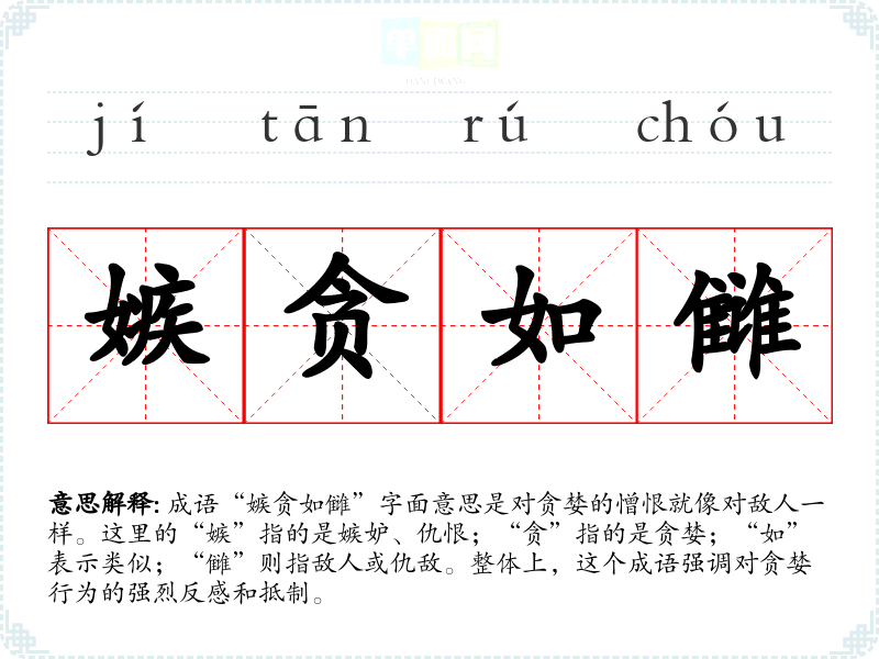 成语“嫉贪如雠”字面意思是对贪婪的憎恨就像对敌人一样。这里的“嫉”指的是嫉妒、仇恨;“贪”指的是贪婪;“如”表示类似;“雠”则指敌人或仇敌。整体上,这个成语强调对贪婪行为的强烈反感和抵制。