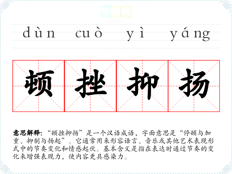 “顿挫抑扬”是一个汉语成语,字面意思是“停顿与加重、抑制与扬起”。它通常用来形容语言、音乐或其他艺术表现形式中的节奏变化和情感起伏。基本含义是指在表达时通过节奏的变化来增强表现力,使内容更具感染力。