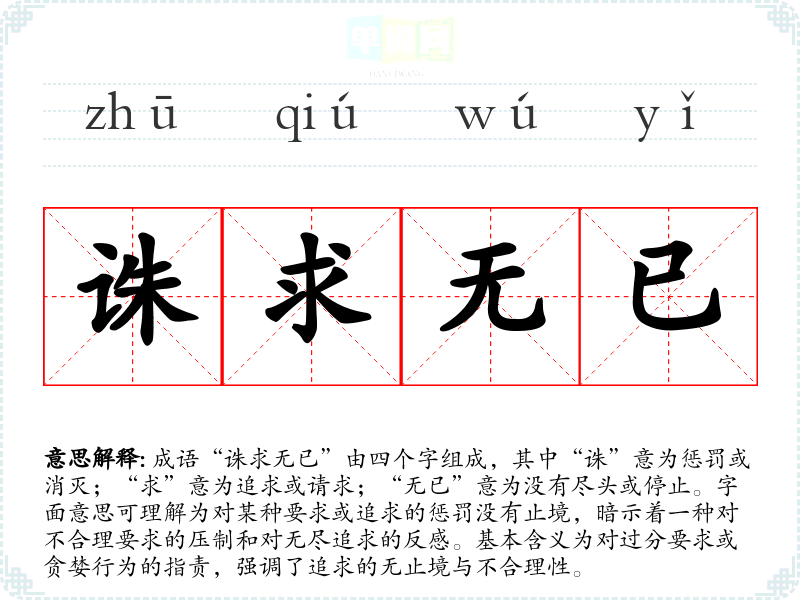 成语“诛求无已”由四个字组成,其中“诛”意为惩罚或消灭;“求”意为追求或请求;“无已”意为没有尽头或停止。字面意思可理解为对某种要求或追求的惩罚没有止境,暗示着一种对不合理要求的压制和对无尽追求的反感。基本含义为对过分要求或贪婪行为的指责,强调了追求的无止境与不合理性。