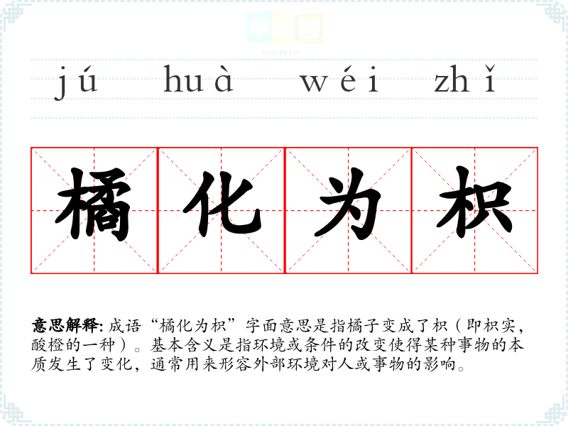 成语“橘化为枳”字面意思是指橘子变成了枳(即枳实,酸橙的一种)。基本含义是指环境或条件的改变使得某种事物的本质发生了变化,通常用来形容外部环境对人或事物的影响。