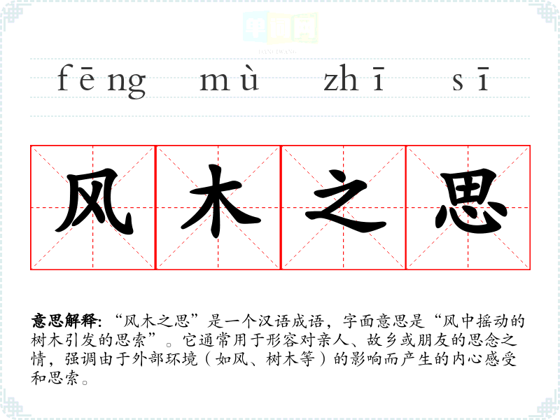 - 同义成语:如“思乡之情”、“相思之苦”,这些成语都表达了思念的情感,但“风木之思”更强调自然环境对思念的触发。