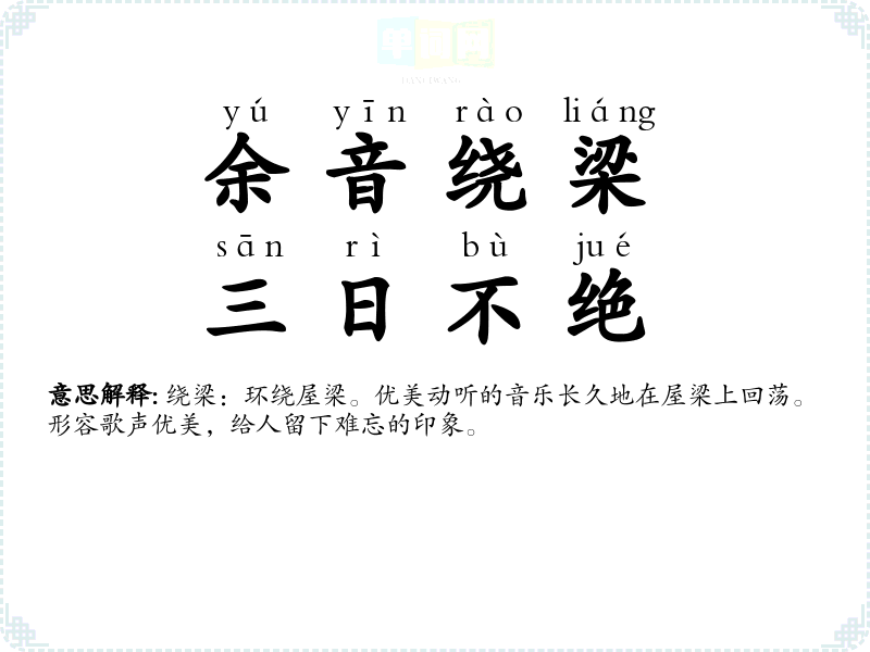 | 余音绕梁,三日不绝 | 绕梁:环绕屋梁。优美动听的音乐长久地在屋梁上回荡。形容歌声优美,给人留下难忘的印象。 |