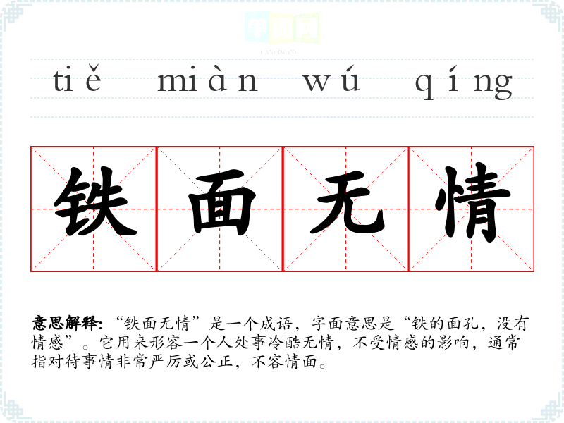 “铁面无情”是一个成语,字面意思是“铁的面孔,没有情感”。它用来形容一个人处事冷酷无情,不受情感的影响,通常指对待事情非常严厉或公正,不容情面。