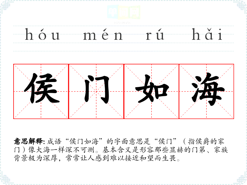 成语“侯门如海”的字面意思是“侯门”(指侯爵的家门)像大海一样深不可测。基本含义是形容那些显赫的门第、家族背景极为深厚,常常让人感到难以接近和望而生畏。