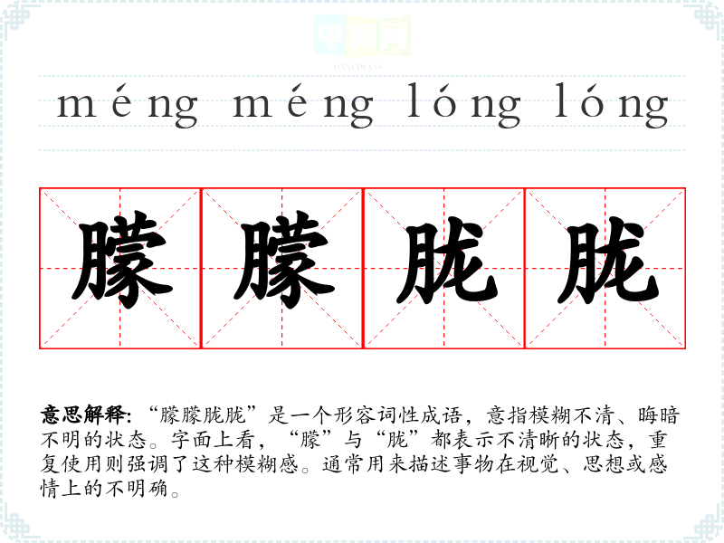 “朦朦胧胧”是一个形容词性成语,意指模糊不清、晦暗不明的状态。字面上看,“朦”与“胧”都表示不清晰的状态,重复使用则强调了这种模糊感。通常用来描述事物在视觉、思想或感情上的不明确。