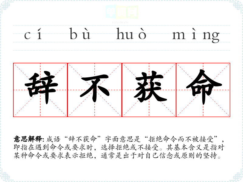 成语“辞不获命”字面意思是“拒绝命令而不被接受”,即指在遇到命令或要求时,选择拒绝或不接受。其基本含义是指对某种命令或要求表示拒绝,通常是出于对自己信念或原则的坚持。