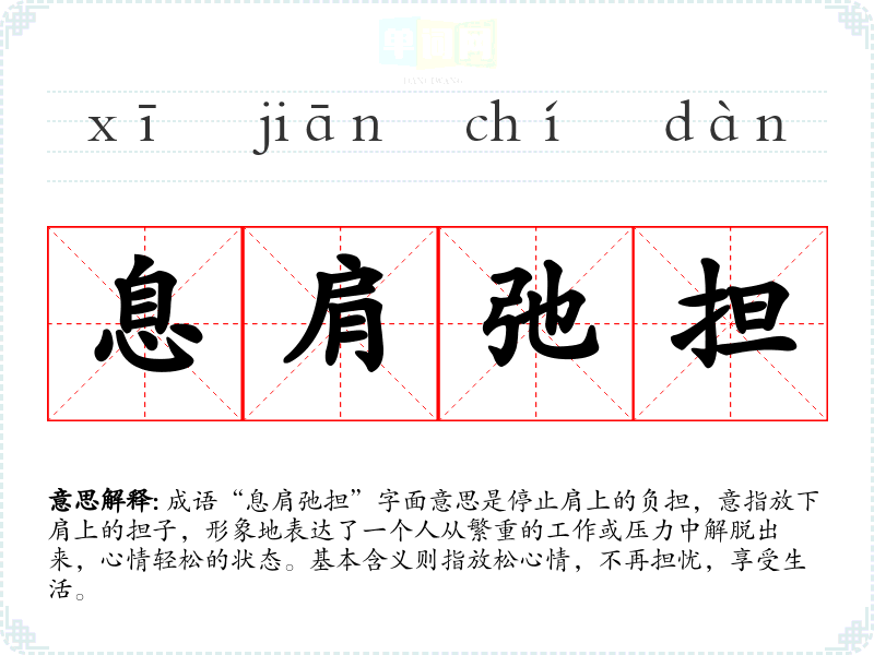成语“息肩弛担”字面意思是停止肩上的负担,意指放下肩上的担子,形象地表达了一个人从繁重的工作或压力中解脱出来,心情轻松的状态。基本含义则指放松心情,不再担忧,享受生活。