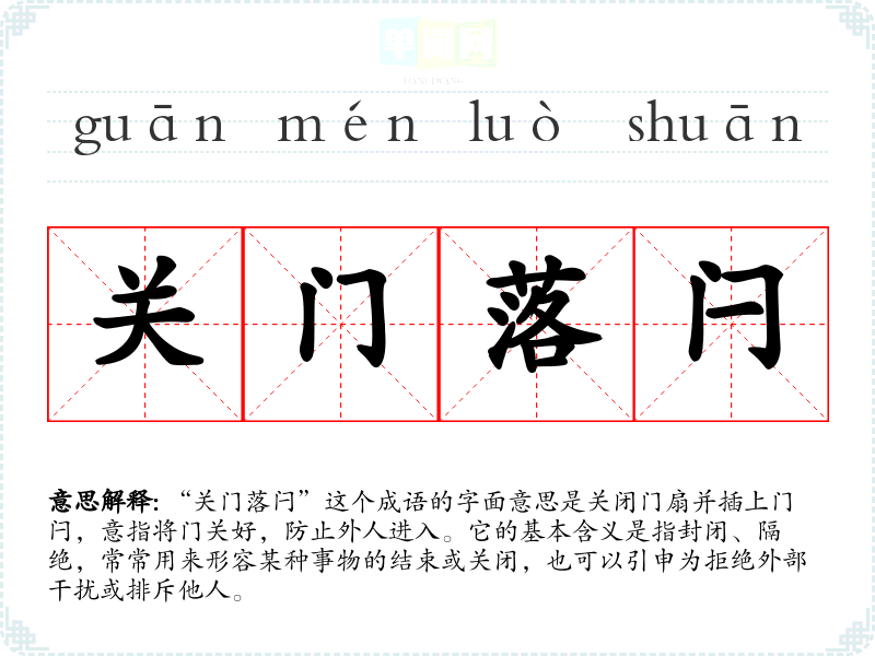 “关门落闩”这个成语的字面意思是关闭门扇并插上门闩,意指将门关好,防止外人进入。它的基本含义是指封闭、隔绝,常常用来形容某种事物的结束或关闭,也可以引申为拒绝外部干扰或排斥他人。