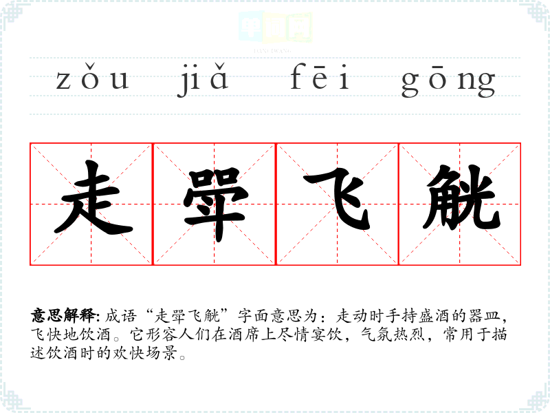 成语“走斝飞觥”字面意思为:走动时手持盛酒的器皿,飞快地饮酒。它形容人们在酒席上尽情宴饮,气氛热烈,常用于描述饮酒时的欢快场景。