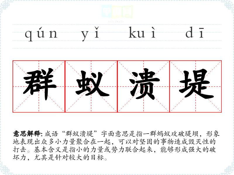 成语“群蚁溃堤”字面意思是指一群蚂蚁攻破堤坝,形象地表现出众多小力量聚合在一起,可以对坚固的事物造成毁灭性的打击。基本含义是指小的力量或势力联合起来,能够形成强大的破坏力,尤其是针对较大的目标。