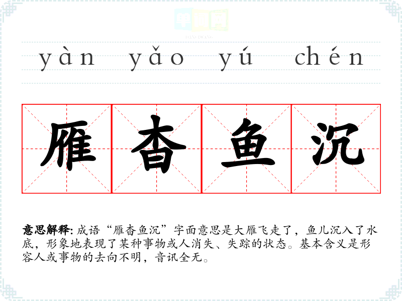 成语“雁杳鱼沉”字面意思是大雁飞走了,鱼儿沉入了水底,形象地表现了某种事物或人消失、失踪的状态。基本含义是形容人或事物的去向不明,音讯全无。